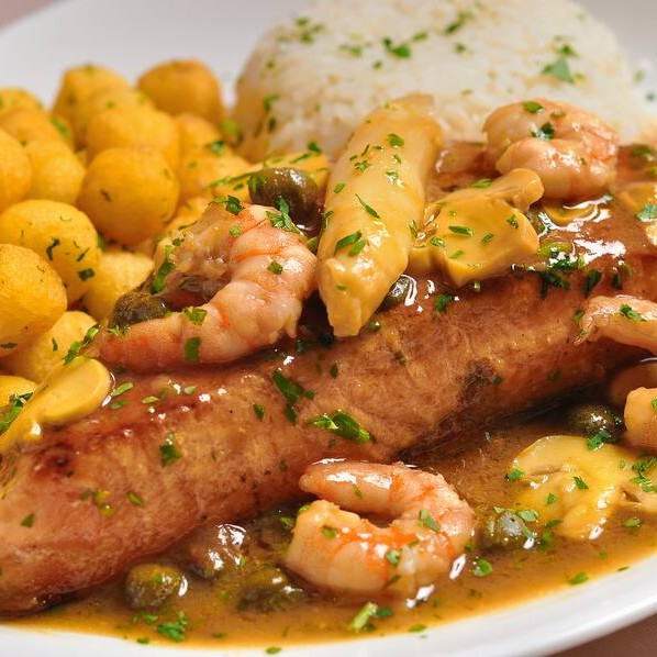 Filé de Abadejo em molho de alcaparras com champignon, aspargos e camarão. Acompanha arroz e batata grisette