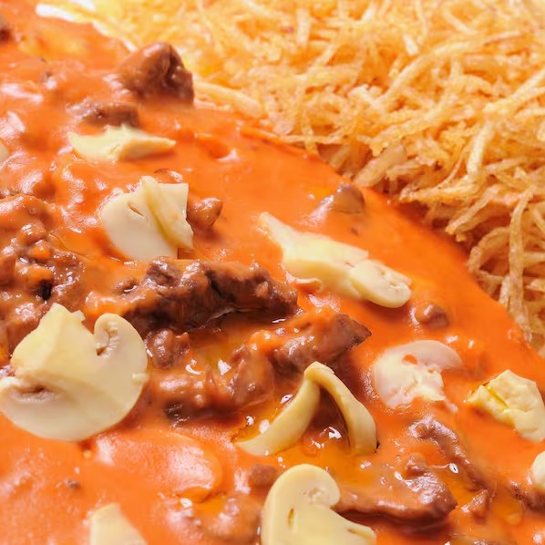 Tiras de Filé Mignon ao molho catchup, creme de leite e champignon. Acompanha arroz e batata palha