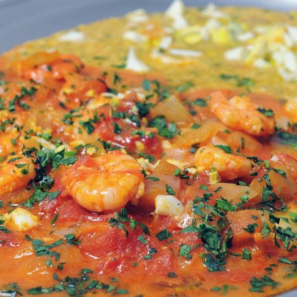 Filé de Abadejo à doré com molho de tomate acebolado camarão. Acompanha arroz e pirão