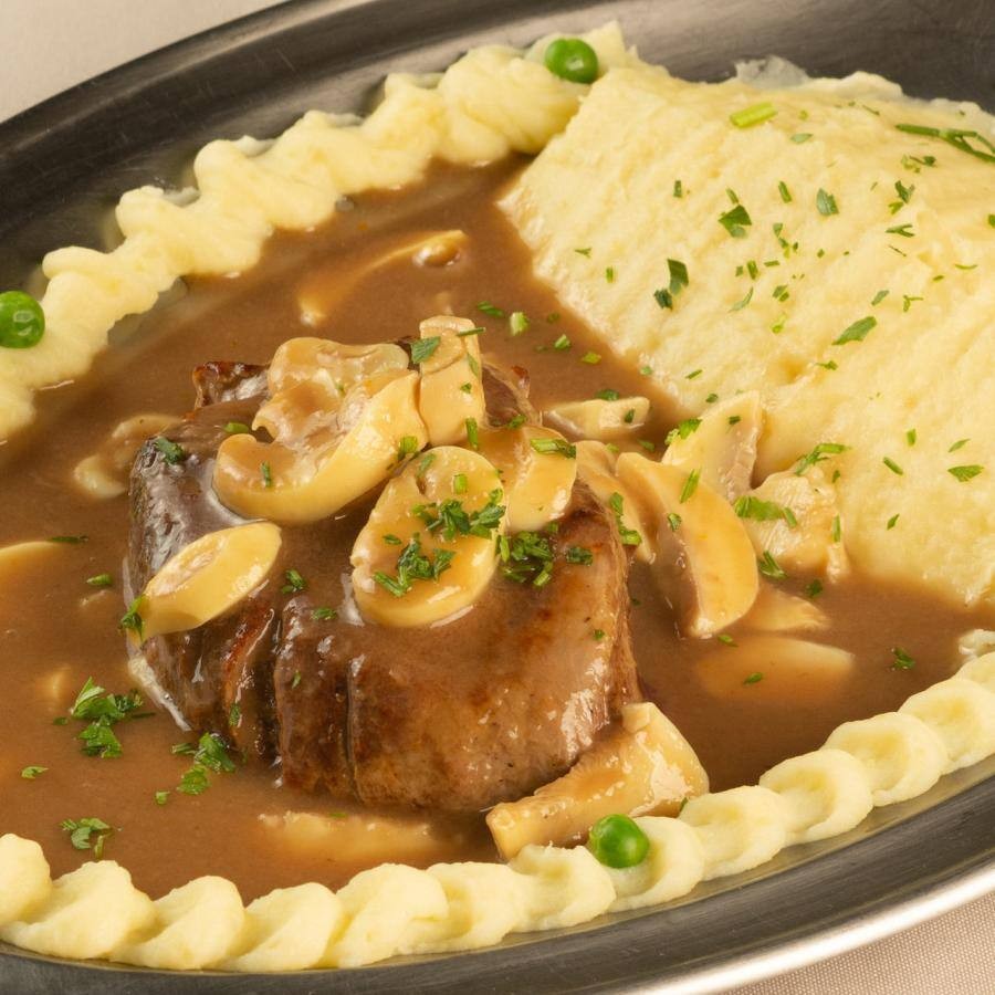 Medalhão (alto) ao molho madeira com champignon. Acompanha arroz e purê de batatas