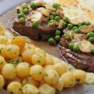 Medalhão com bacon ao molho madeira, champignons e ervilhas. Acompanha arroz, creme de aspargos e batata grisette