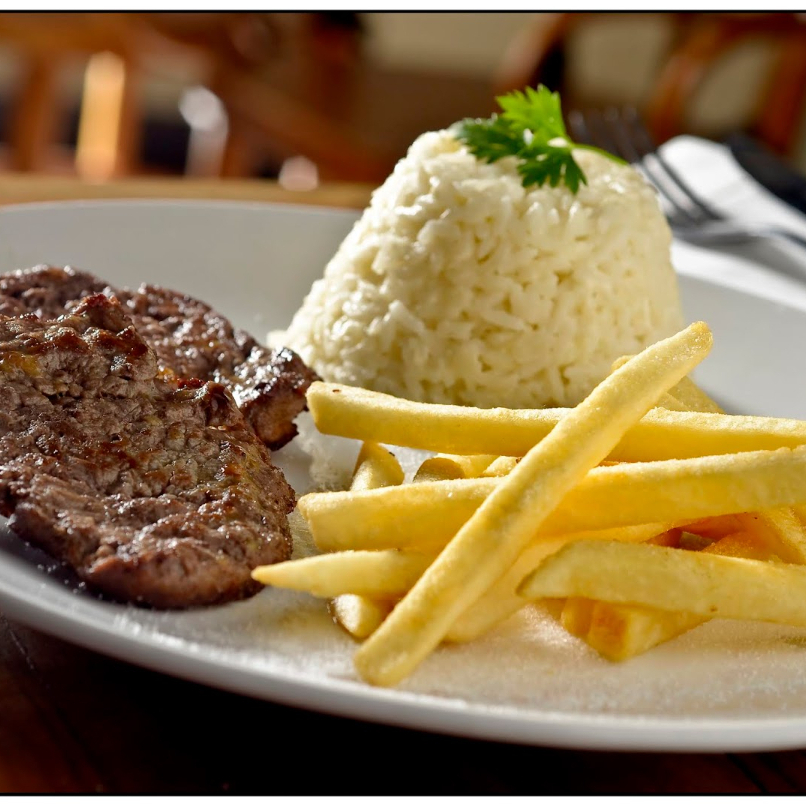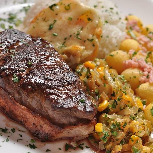 Filé Mignon grelhado. Acompanha arroz com molho madeira, champignon e batata grisette.