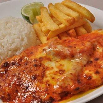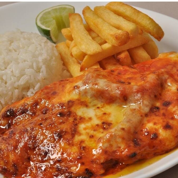 Filé de frango à milanesa coberto com muçarela e molho ao sugo. Acompanha arroz e fritas
