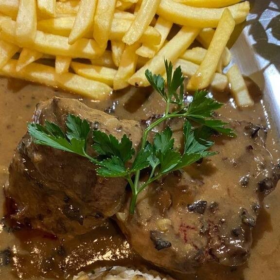 Filé mignon grelhado, molho madeira com funghi secchi. Acompanha arroz com castanha de caju, espinafre e fritas