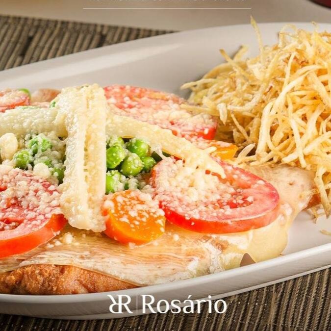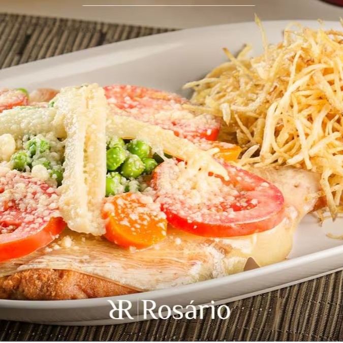 Filé mignon à milanesa coberto com muçarela, Catupiry, aspargos, cenoura e ervilhas. Acompanha arroz e batata palha