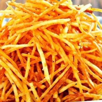 Tiras de peito de frango ao molho. Acompanha arroz e batata palha