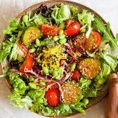 Alface, tomate, palmito, batata, ervilha, presunto e ovo.