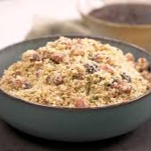 Arroz branco com lascas de camarão ao molho de tomate e ervilha.