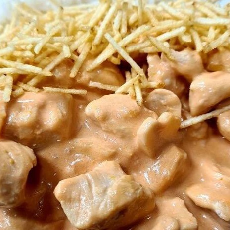 Marmita de Strogonoff de Frango, Arroz Feijão e Batata Palha! Esse clássico tem: Arroz Branco, Feijão, Strogonoff de Frango e Batata Palha! Nosso strogonoff de frango é preparado com cubinhos suculentos de frango, refogados e envoltos em um cremoso molho à base de creme de leite e molho de tomate, com um toque especial da casa. Esse item não possui outras Guarnições!