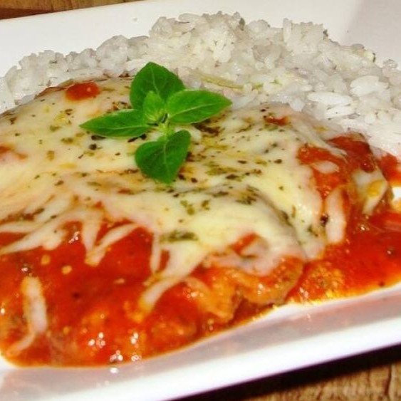 Arroz branco soltinho com parmegiana de frango empanado crocante, coberto com molho de tomate artesanal e queijo derretido, acompanhado de guarnições que completam a refeição. Uma opção deliciosa, caseira e perfeita para quem busca sabor e satisfação.