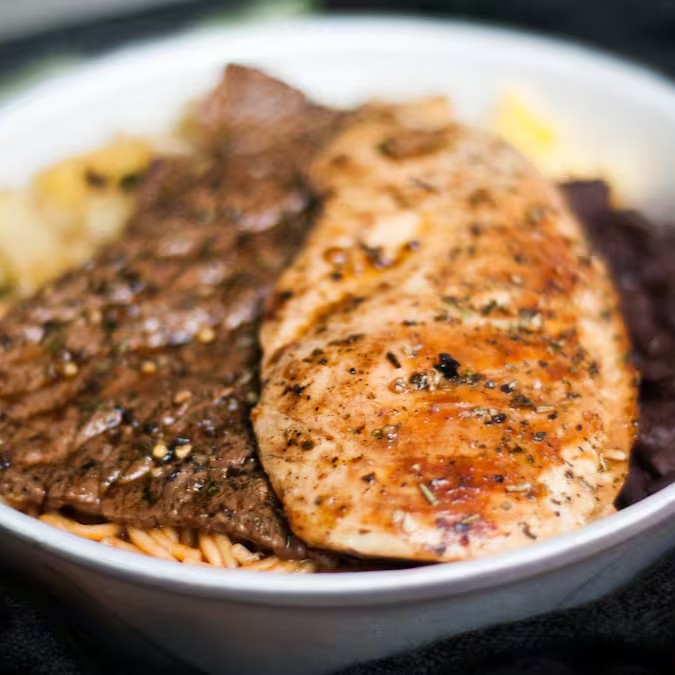 Marmitex com arroz soltinho, feijão fresquinho, frango grelhado suculento, batata frita crocante e farofa saborosa. Uma refeição completa, caseira e irresistível para matar a fome com muito sabor!