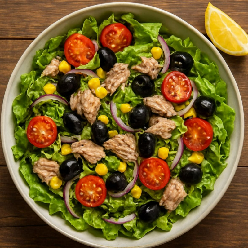 Deliciosa Salada de Atum acompanhada de: tomate, batata, cebola, azeitona, rúcula ,alface, crutons, vinagreta.