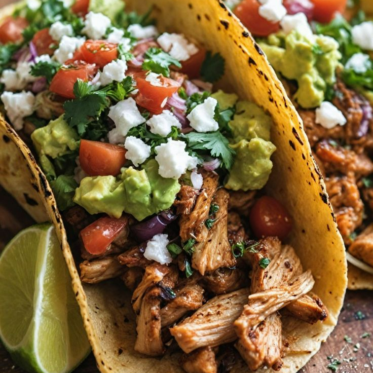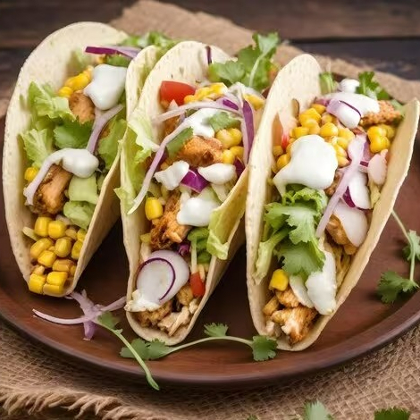 Frango, queijo muçarela, guacamole, cebola, coentro. esses Tacos Mexicanos são uma explosão de sabor! Porção generosa servindo muito bem uma pessoa.