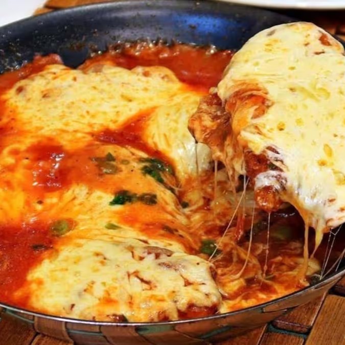 Acompanha Arroz, Feijão, Suculenta Parmegiana de Frango e 2 Guarnições à sua Escolha!