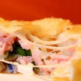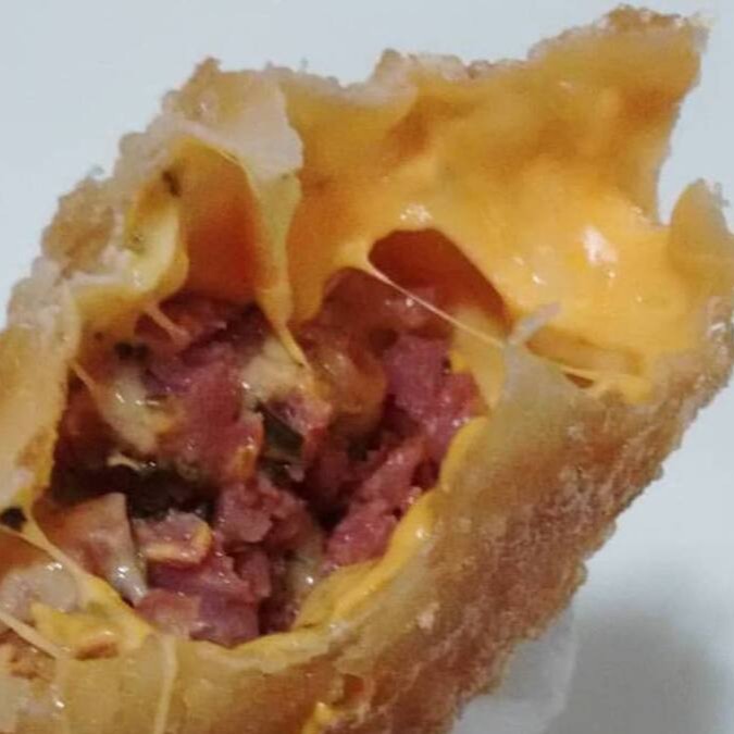 Pastel de Três Queijos, com queijo mussarela e Catupiry e Cheddar com bacon picado