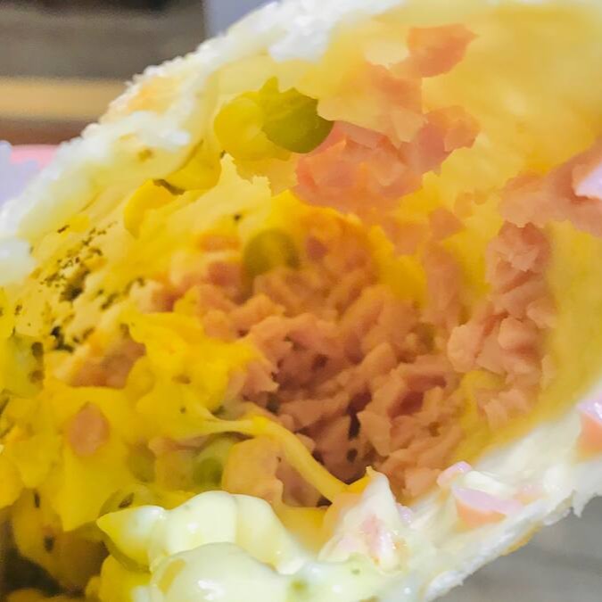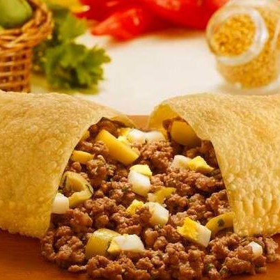 Com recheio de carne moída com molho de tomate, molho de pimenta e especiarias, cebola picada, tomate picado e milho.