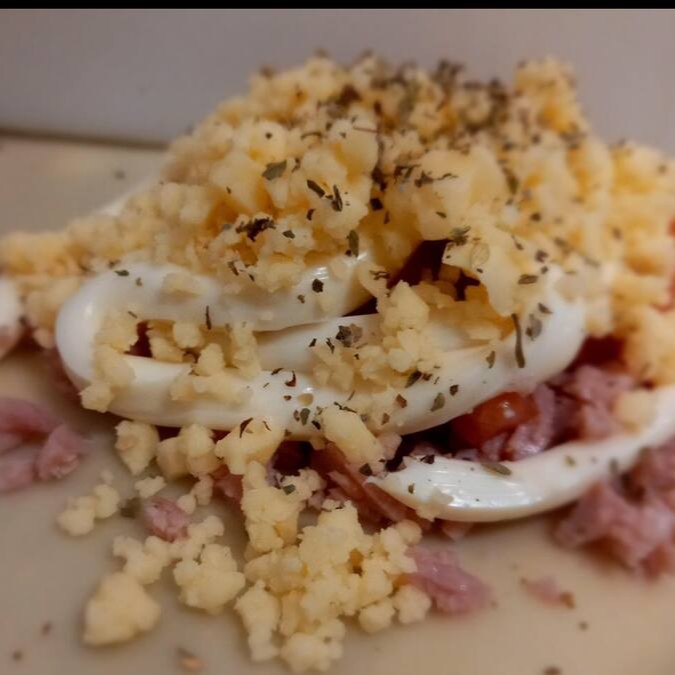 Pastel com presunto picado, queijo mussarela, ovo cozido picado, ervilha, cebola picada e orégano.
