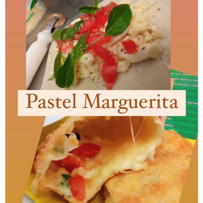 Pastel de Queijo mussarela com tomate picado e azeitona fatiada