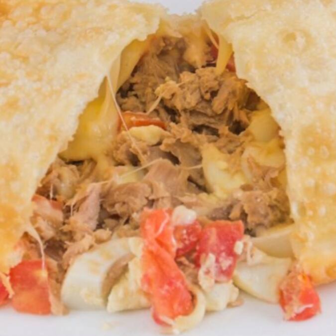 Pastel com Atum com queijo, cebola picada e azeitona fatiada