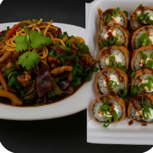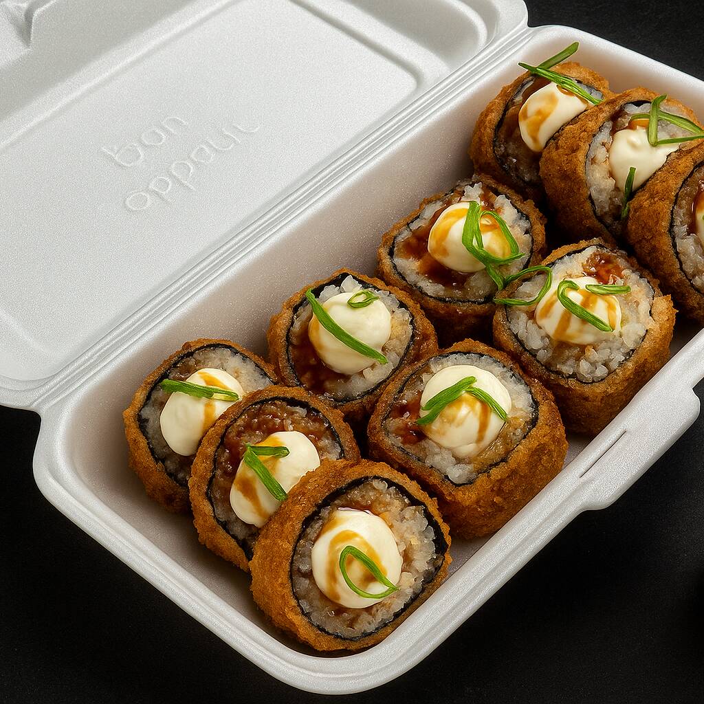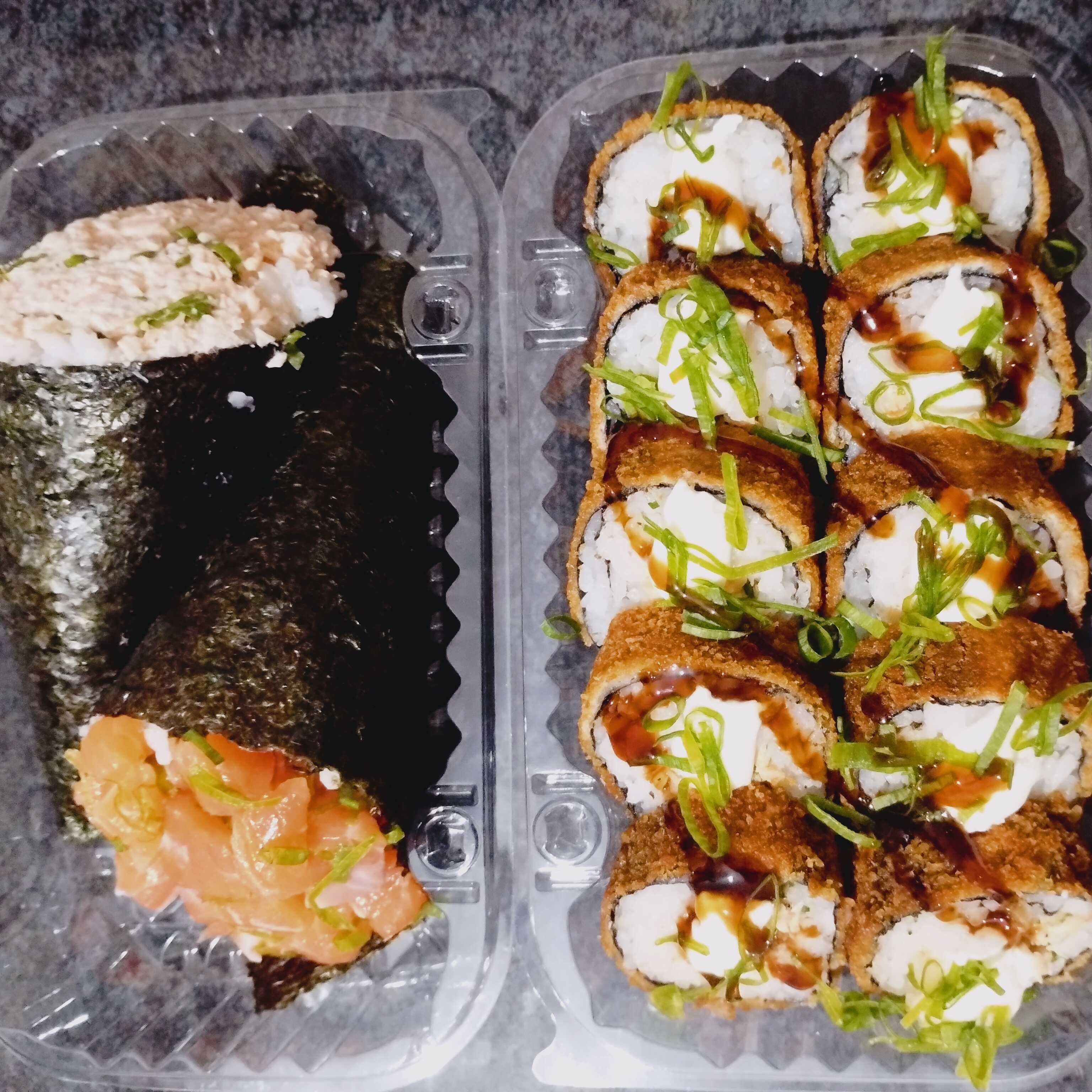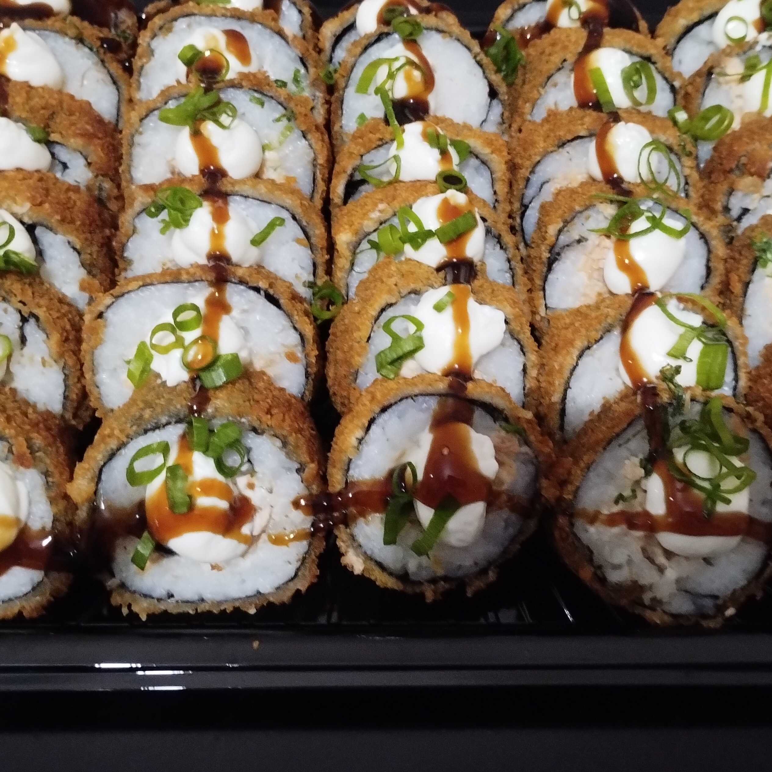 Alga, Gohan, salmão grelhado Cream Cheese e cebolinha,empanado e frito