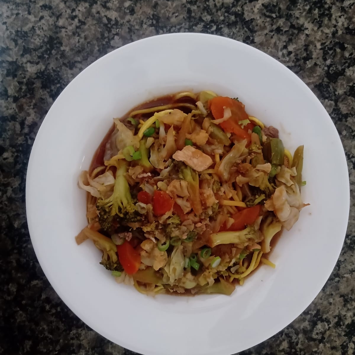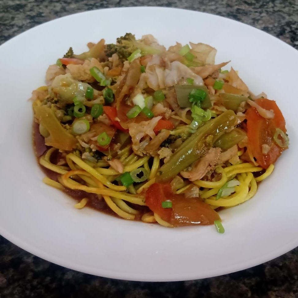 Frango,macarrão frito, cenoura, repolho,couve-flor,brócolis,molho shoyu e cebolinha
