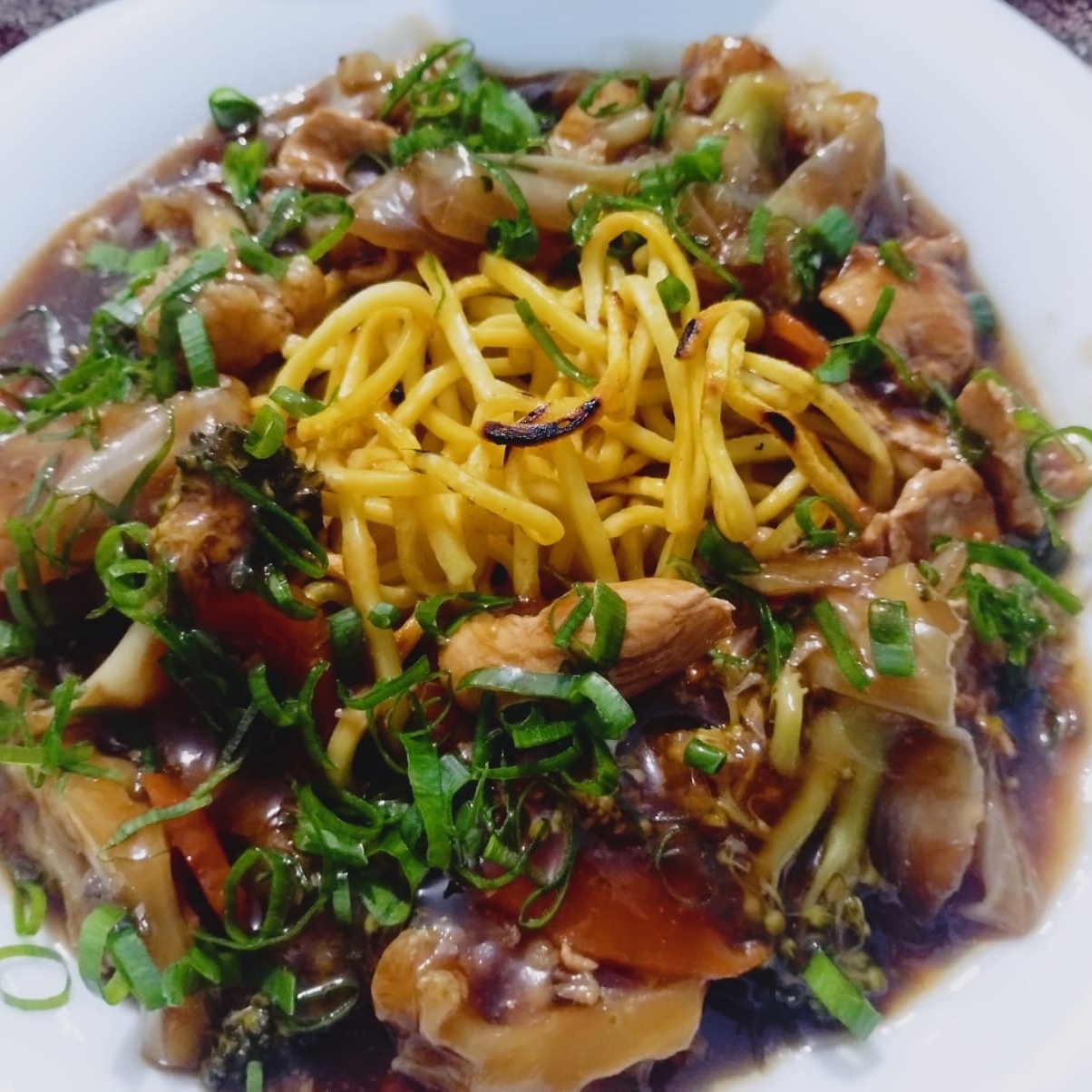 Frango,carne,macarrão frito, cenoura, repolho,couve-flor,brócolis,molho shoyu e cebolinha