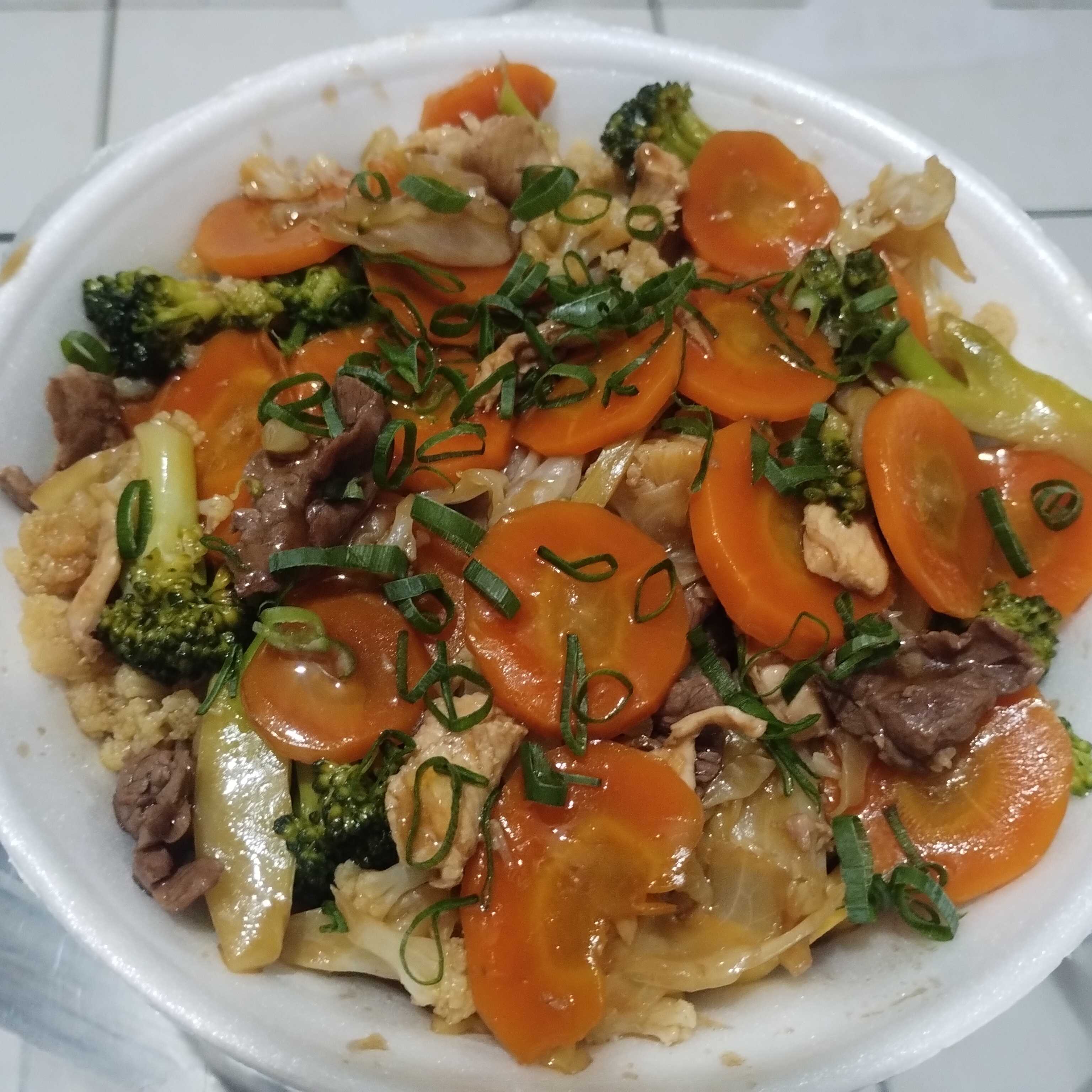 Tudo feito na hora(Carne,macarrão frito, cenoura, repolho,couve-flor,brócolis,molho shoyu e cebolinha)
