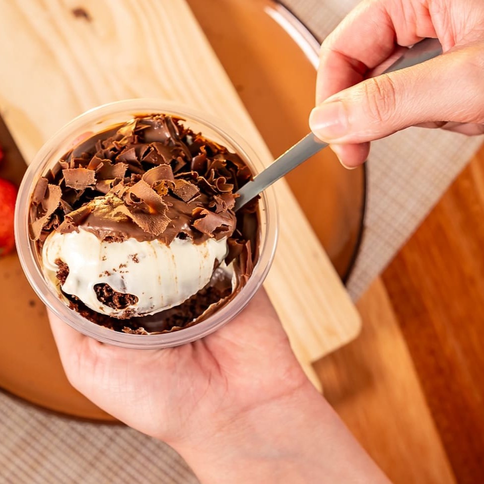 Casca de sorvete banhada no chocolate ao leite, recheada com Nutella pura.