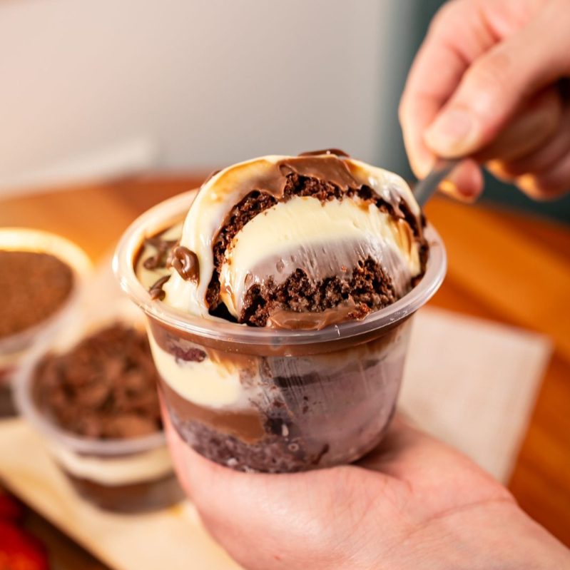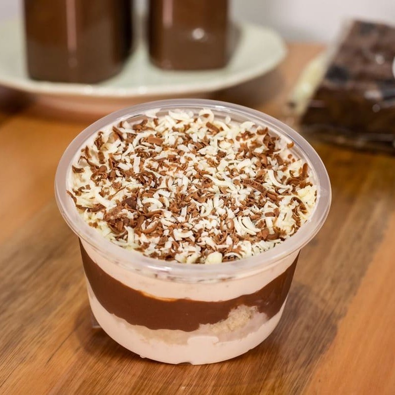 Composto com deliciosas camadas de mousse de Nutella, Nutella pura, brigadeiro branco e Ninho ( não alteramos em nenhum produto ou retira/ adiciona ingrediente )