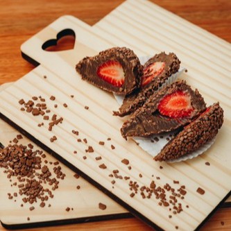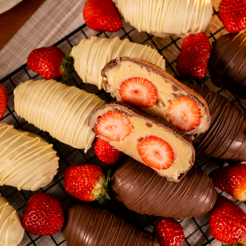 Morango, enrolado com brigadeiro branco, e coberto com chocolate ao leite ( não fazemos alteramos em nenhum produto ou retira/ adiciona ingrediente )