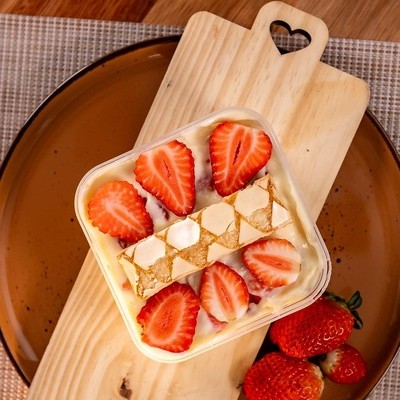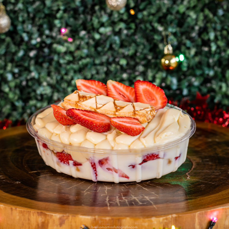 Composto com delicioso creme gelado, morangos e biscoito folhado sfogliatine ( não alteramos em nenhum produto ou retira/ adiciona ingrediente)