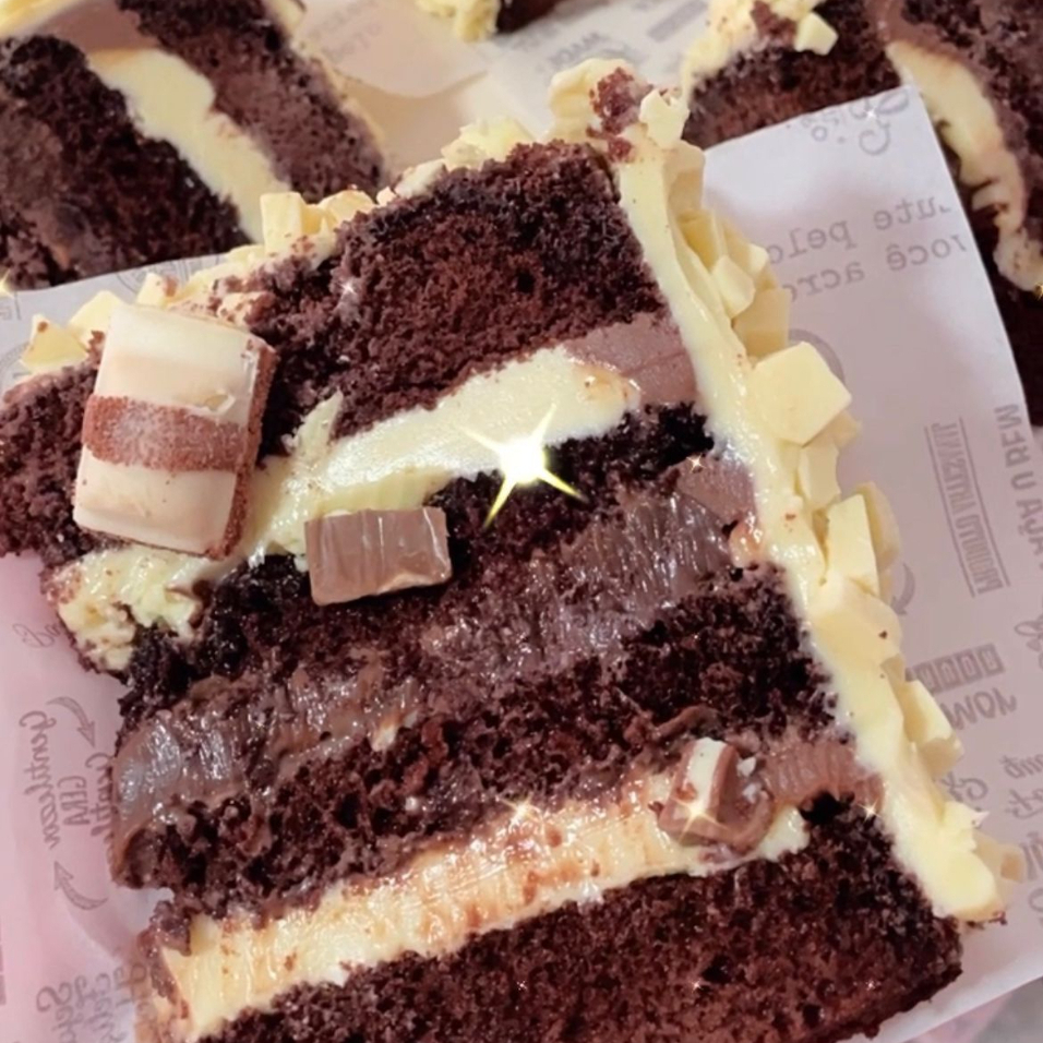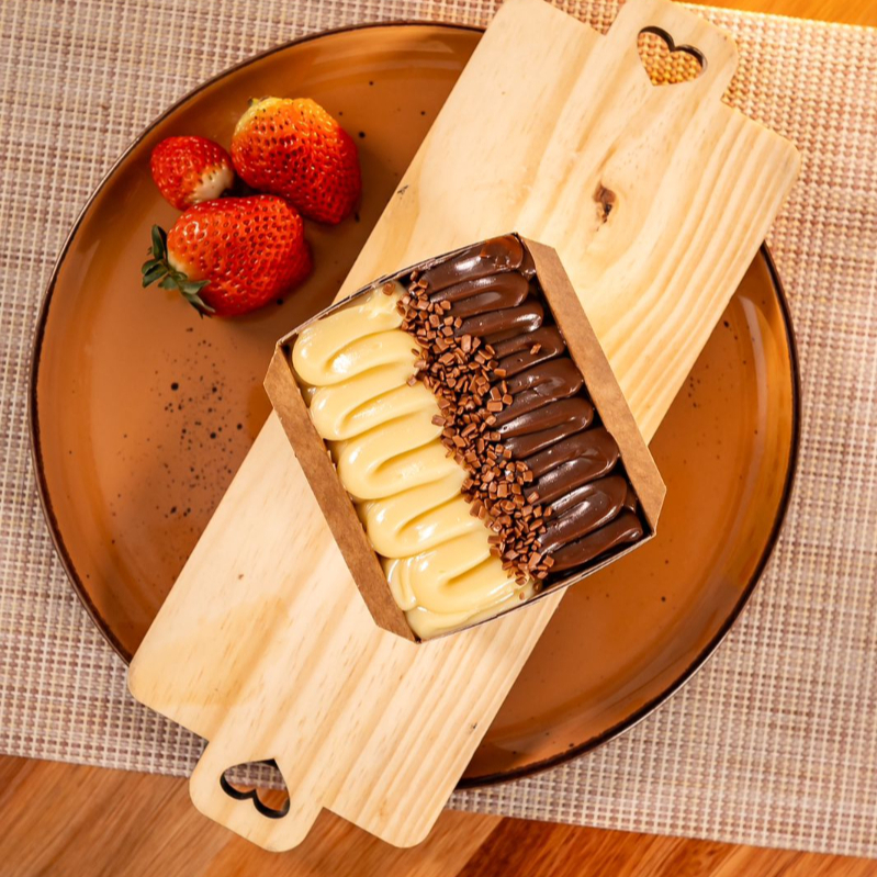 Massa de Chocolate com recheio chocolate ao leite e chocolate Branco ( não alteramos em nenhum produto ou retira/ adiciona ingrediente )