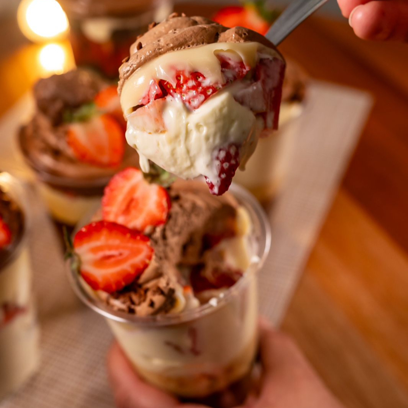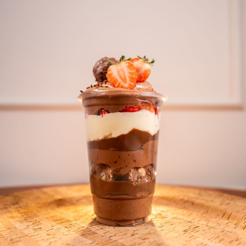 Composto com deliciosas camadas de mousse de Nutella, pedaços de ferrero rocher, Nutella pura e morangos , mousse de Ninho ( não alteramos em nenhum produto ou retira/ adiciona ingrediente )
