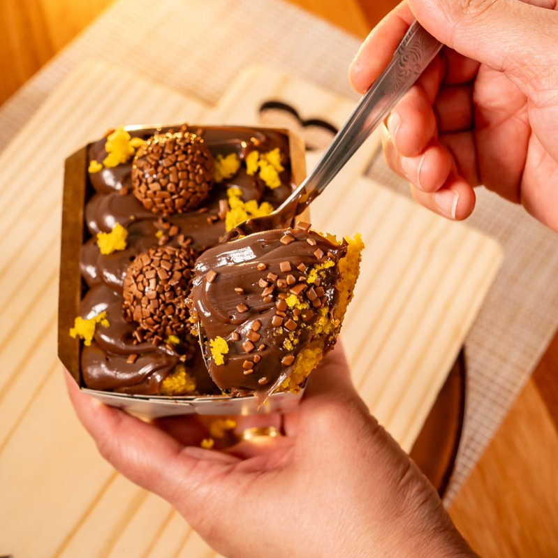 Massa De Chocolate com recheio de brigadeiro finalizado com Granulado callebaut ( não alteramos em nenhum produto ou retira/ adiciona ingrediente )