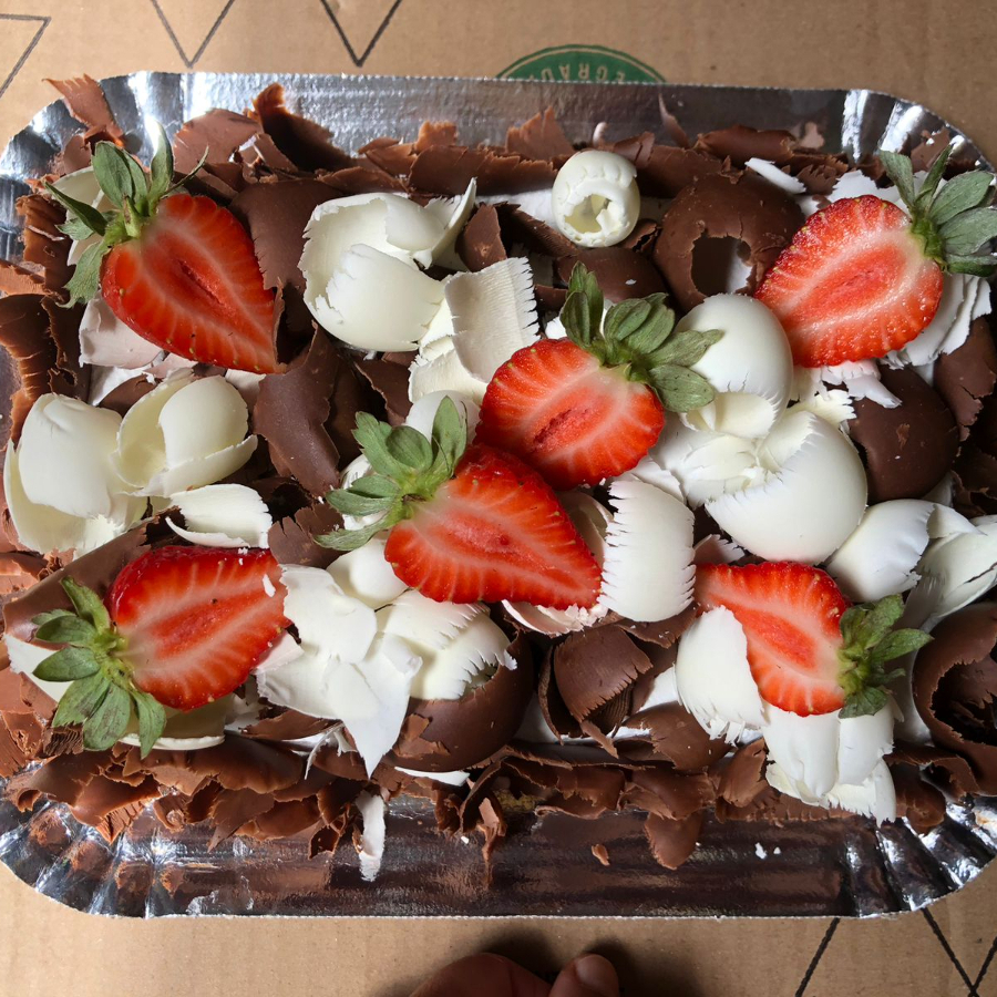 Massa de chocolate com cobertura em cima de Ninho e Nutella pura, decorado com morangos. ( não fazemos alteramos em nenhum produto ou retira/ adiciona ingrediente )