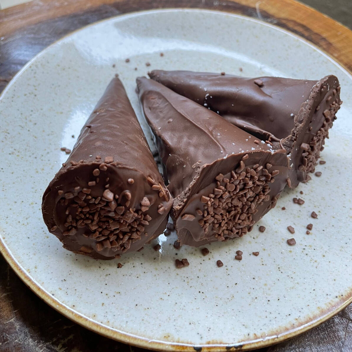 casquinha de sorvete , coberto com chocolate ao leite , e recheio de doce de leite