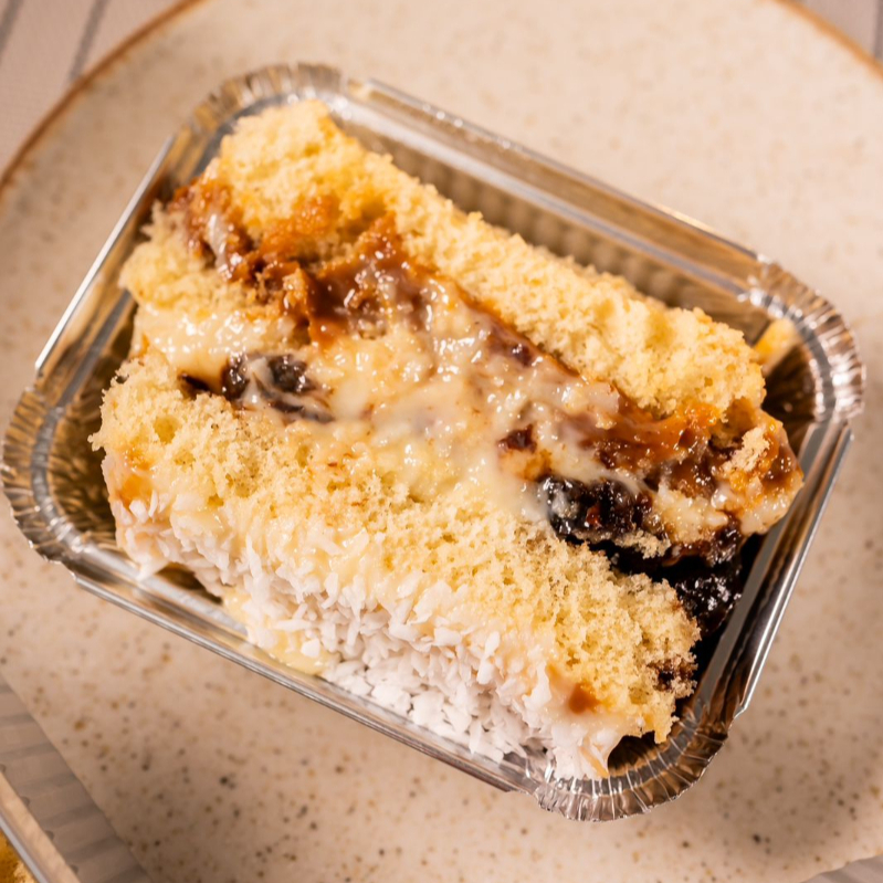 Massa de pão de ló branca , doce de leite, coco cremoso e pedaços de ameixa. ( não fazemos alteramos em nenhum produto ou retira/ adiciona ingrediente )