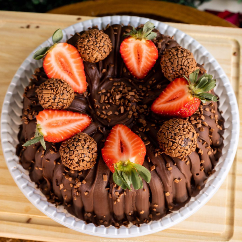 Massa de chocolate , com chocolate , decorado com brigadeiros e morangos peso final de 1,100kg ( não fazemos alteramos em nenhum produto ou retira/ adiciona ingrediente )