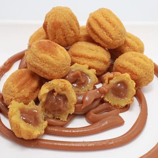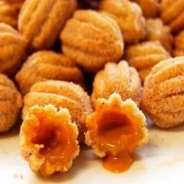 Mini churros fritos na hora, recheados com doce de leite e polvilhados com açúcar e canela.