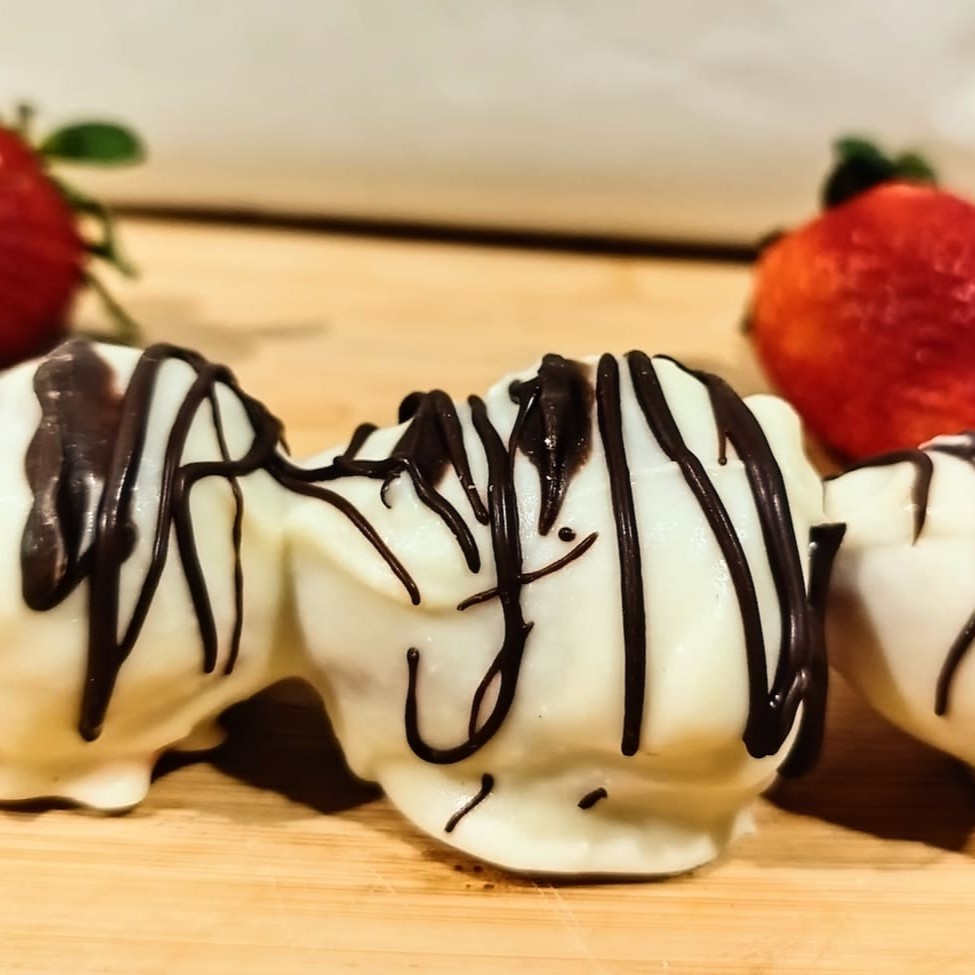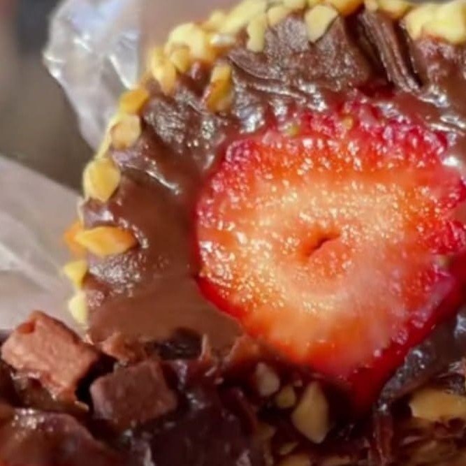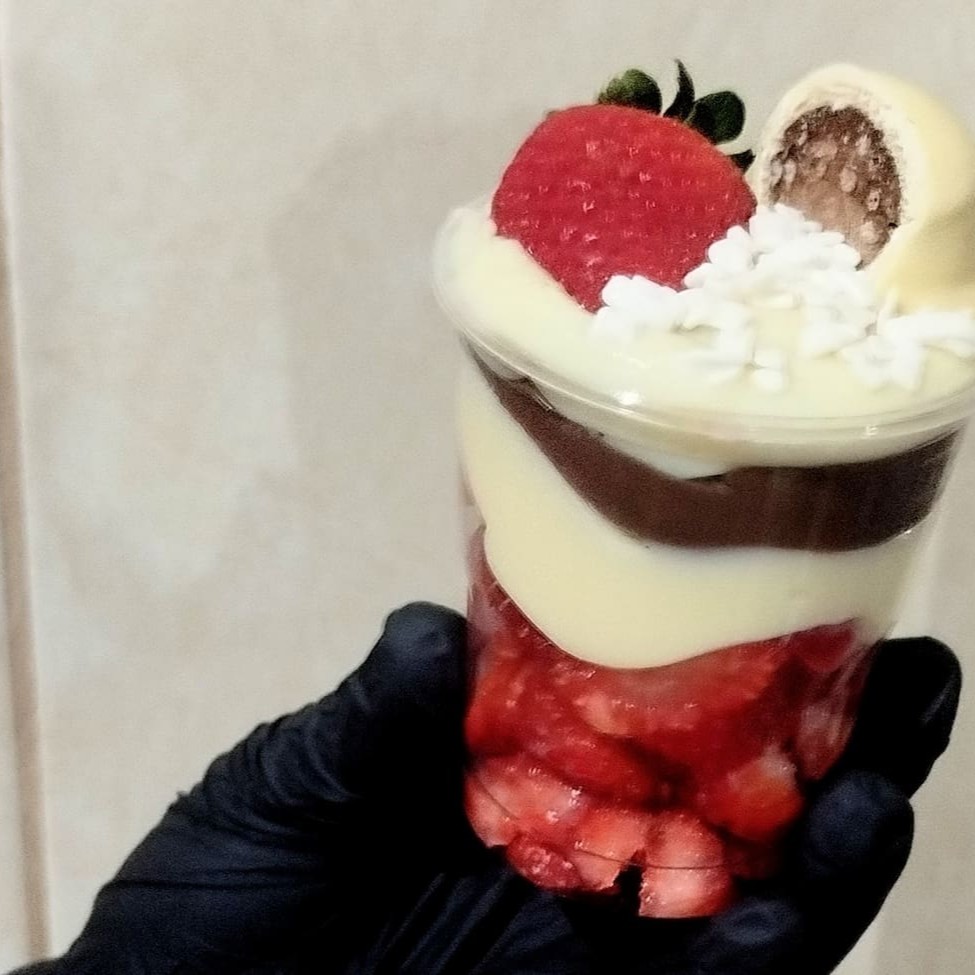 Delicioso bom bom morango do nordeste Deliciosa casquinha de chocolate bland Com irresistível creme branco cremoso Suculentos morangos fresquinhos Finalizando com fios de chocolate branco
