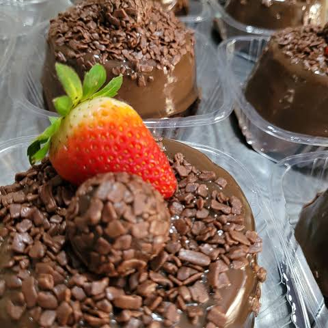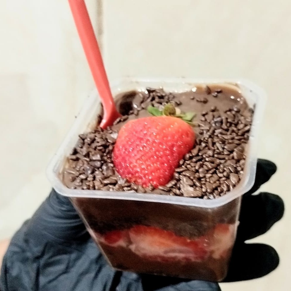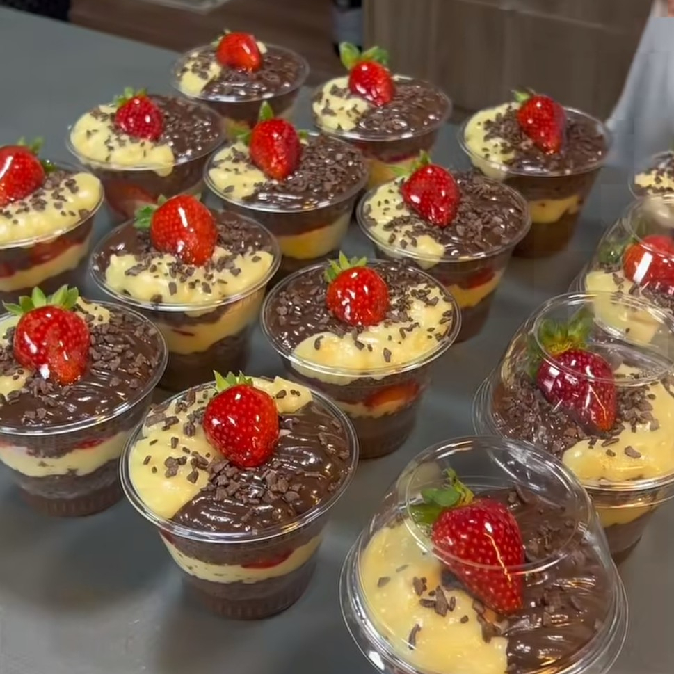 Bolo de pote brigadeiro com morangos frescos Delicioso bolo fresquinho massa preta , levemente umidecido com uma generosa Camada de creme de brigadeiro com deliciosas fatias de morangos fresquinhos, finalizando com mas creme de brigadeiro,morangos frescos e granulado em flocos uma delícia
