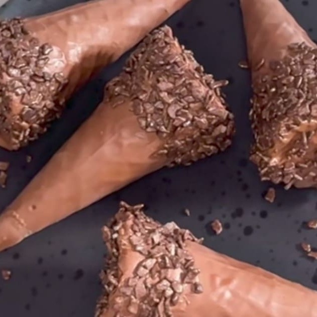 Delicioso cone recheado com creme de Ninho e morangos frescos Picados finalizando com uma deliciosa casquinha de chocolate
