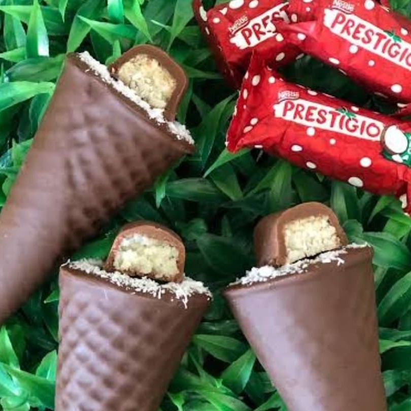 Apresentamos o 'Prestígio', um sofisticado cone trufado gourmet. A casquinha, crocante e irresistível, é meticulosamente banhada, tanto por dentro quanto por fora, com um creme caseiro de Prestígio, uma mescla de sabor e cremosidade. Para finalizar com requinte, coroamos com um bombom de Prestígio no topo. Este cone é um verdadeiro deleite para os sentidos, uma autêntica obra-prima culinária que promete seduzir seu paladar com a harmonia perfeita de texturas e sabores. Uma experiência absolutamente irresistível para os devotos de chocolate e coco!
