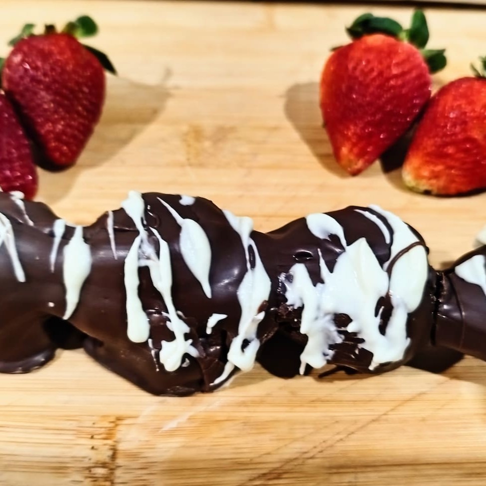Apresentamos nosso exuberante 'Espetinho de Morango com Chocolate Bland'. Este deleite é composto por morangos frescos, suculentos e cuidadosamente selecionados, que são envolvidos por uma camada generosa do mais refinado chocolate Bland. Para finalizar, delicados fios de chocolate branco dão o toque final a esta obra-prima culinária, oferecendo uma combinação de sabores que promete agradar até os paladares mais exigentes. Esta é uma experiência gastronômica única, onde a doçura do chocolate e a acidez do morango se unem em perfeita harmonia.