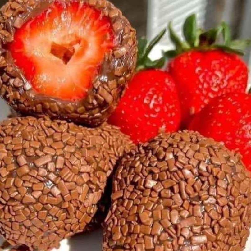 Oque já era uma delícia ficou ainda mas irresistível Apresento o delicioso bombom de morangos fresquinhos Uma generosa camada de morangos frescos seguida de um Delicioso creme de leite Ninho,creme de chocolate blend, mais creme de leite Ninho finalizando com morangos frescos Bombom Ouro Branco e granulado em flocos simplesmente inigualável