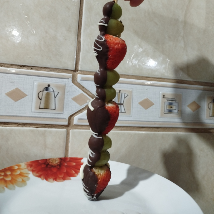 Espetinho De Uvas E Morangos Coberto Com Chocolate Blend