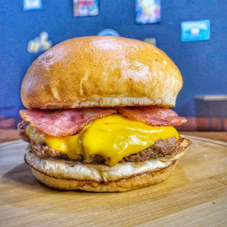 Pão, hamburguer 120g com chreddar fatia derretido e Bacon.