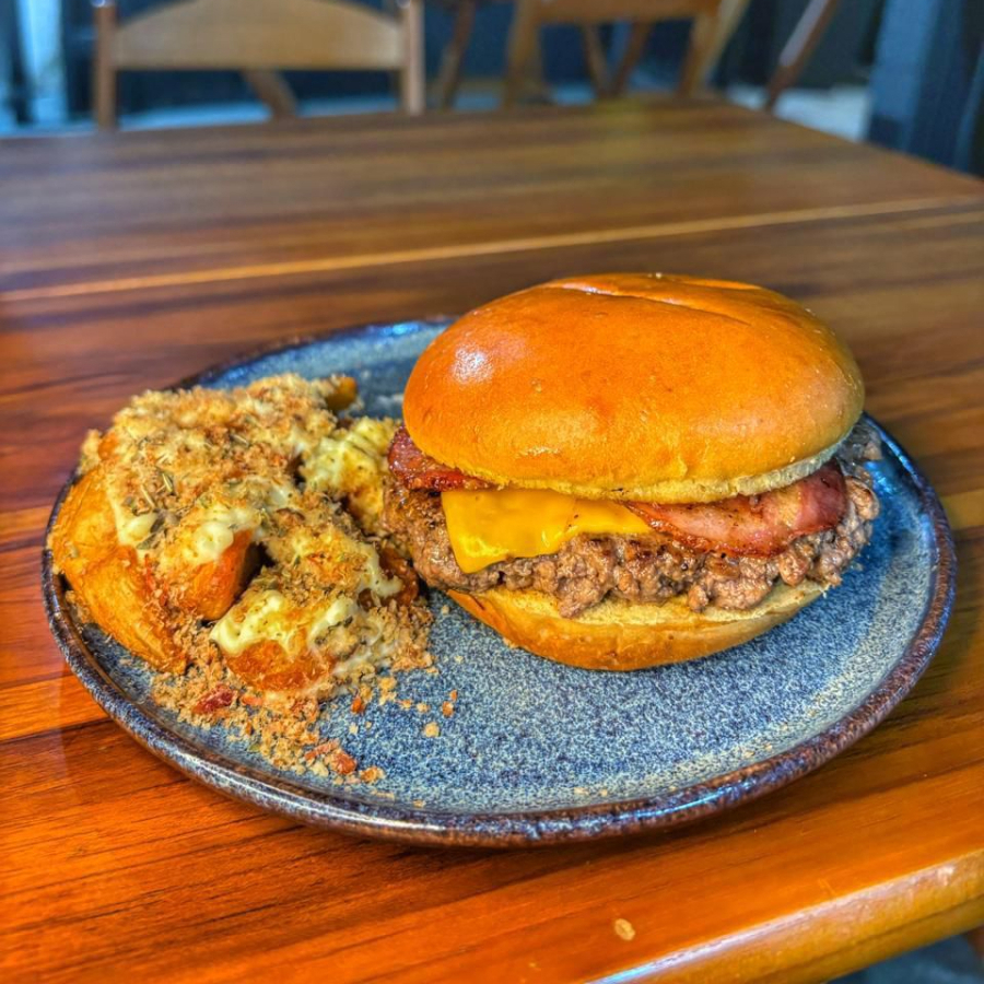 Clássico da Casa com ele não tem erro. Pão de brioche artesanal macio selado na Manteiga recebendo um hambúrguer especial 120g, queijo prato derretido, bacon premium crocante, cebola roxa, tomate e alface fresquinhos. Cortesia da Casa: Batata Rústica e+ a Super Maionese Temperada que é de tirar o fôlego.