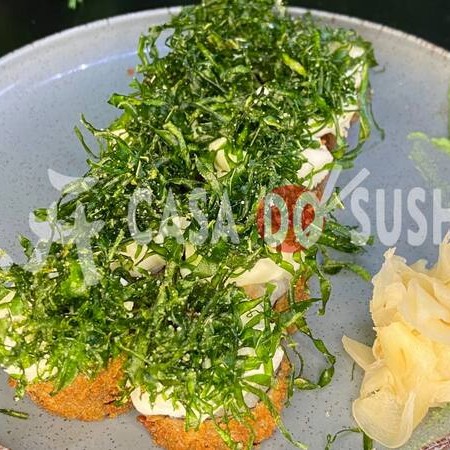 Rolo Empanado e Crocante de Arroz Japonês com Alga Nori. Após a Fritura, é Aberto e Finalizado com Cream Cheese e Salmão Grelhado, Combinando Crocância Externa com Recheio Quente e Sabor Marcante. Finalizado com Cebolinha.