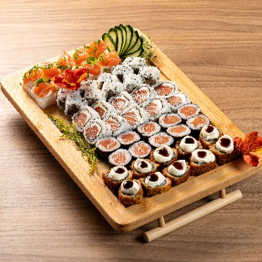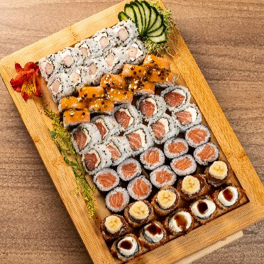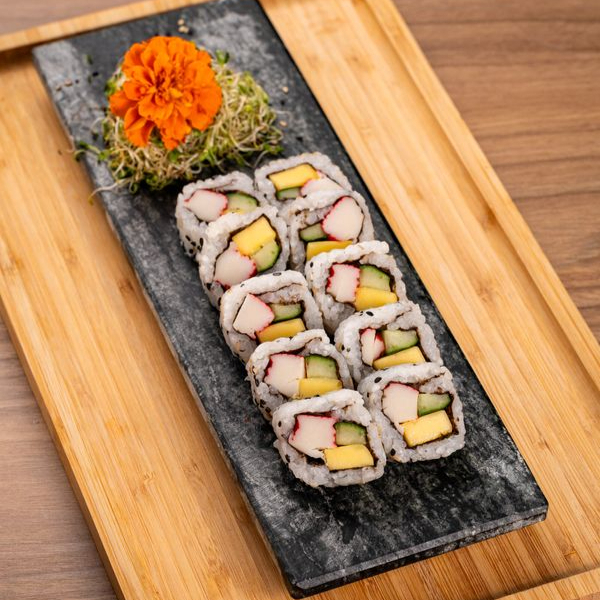 Recheado com kani, manga e pepino crocante, envolto em alga nori, oferece uma explosão de frescor e cremosidade em cada mordida.